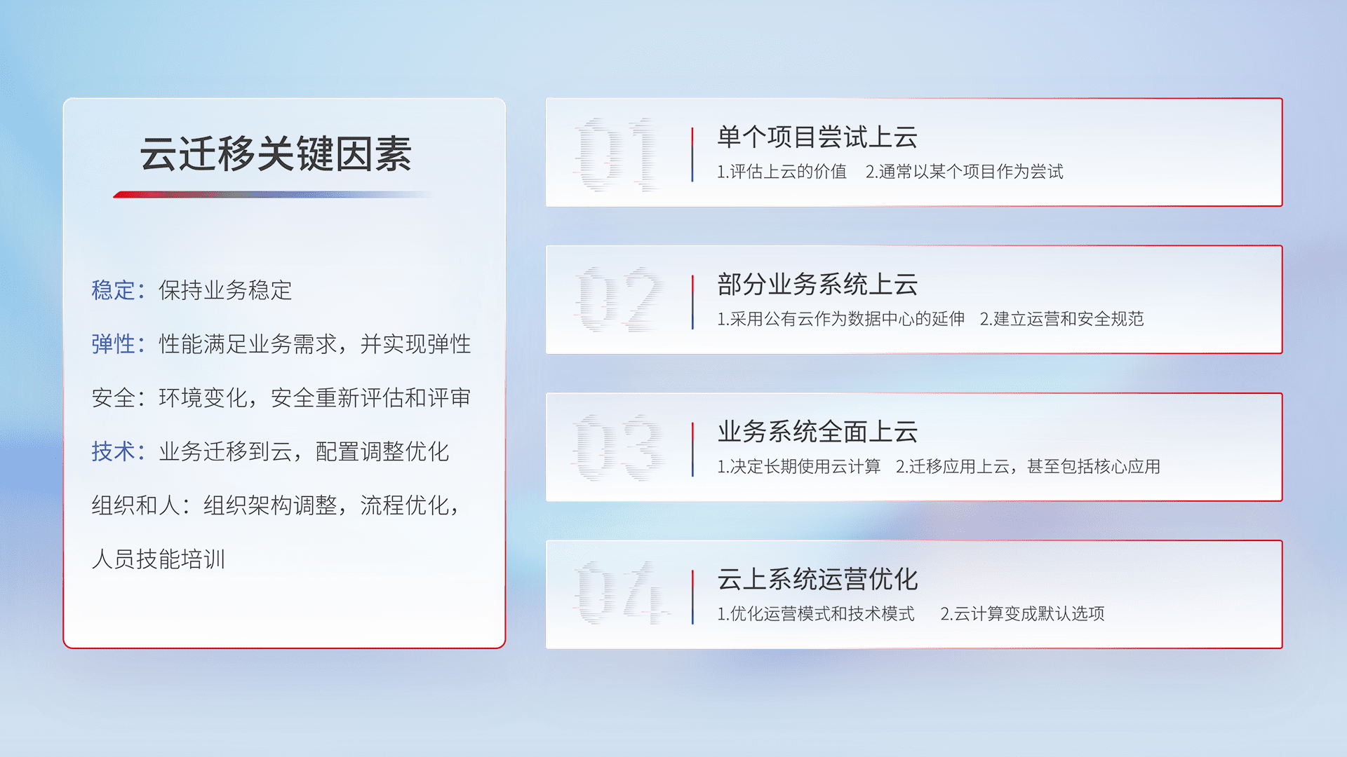 结合实际业务,,,从规划设计、、、、云平台选型、、、、云原生改造、、、数据迁移、、、集成交付,,,,迁移全过程为客户识别最佳上云路径,,,,做好风险识别管理,,,设计网络架构、、、身份权限、、、、安全审计合规、、操作审计、、、日志审计、、、、监控告警策略、、多站点容灾设计等,,,,对云上基础设施进行整体规划,,,,提升IT治理水平,,,,以满足弹性、、、高可用、、、、高性能的需求。。。。