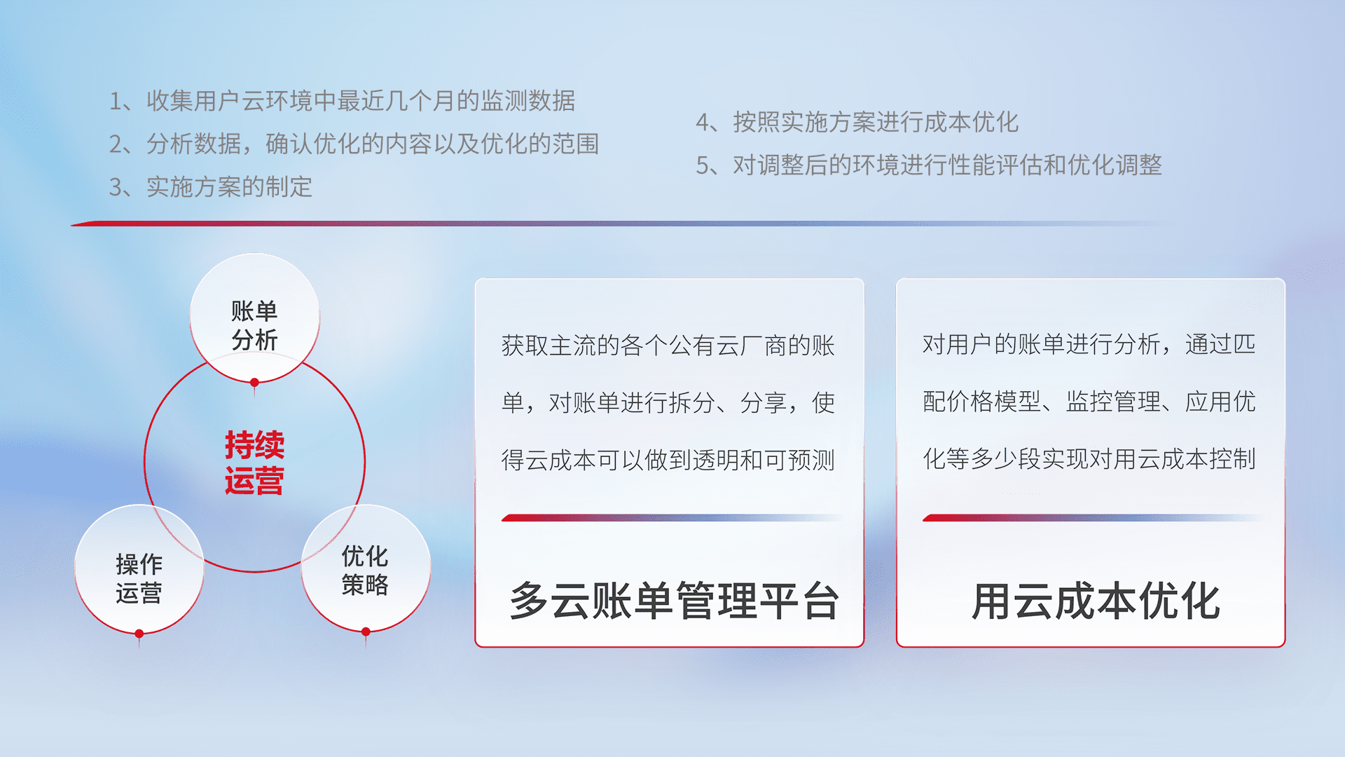 通过多云纳管,,,,以统一的资源数据模型把客户的云资源进行抽象和封装,,进而实现对多云资源的统一操作,,保障云资源管理的可靠性、、、、稳定性与可用性。。。。量身定制化运维内容,,,,配置、、、、开发运维、、、、补丁管理、、、、备份、、、监控、、、认证和访问管理、、、审计和日常巡检等,,,,保障在用云过程中的可靠度,,,稳定度以及高可用率。。